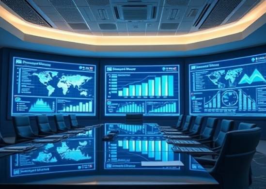 strategic AI solutions, insightful, formulating strategies on digital displays, photorealistic, corporate boardroom with virtual reality interfaces, highly detailed, dynamic graphs and charts, high-resolution texture, cobalt and silver, soft studio lighting, shot with a 100mm lens.