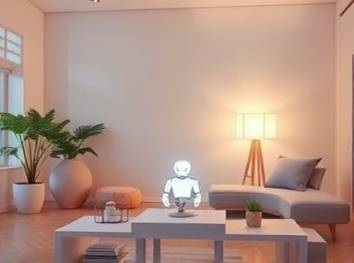 inquisitive AI guidance, thoughtful, mentoring on digital platforms, photorealistic, minimalist tech lounge with floating digital assistant, highly detailed, responsive holographic elements, ultra-HD clarity, pastel tones, warm cozy lighting, shot with a macro lens.